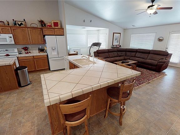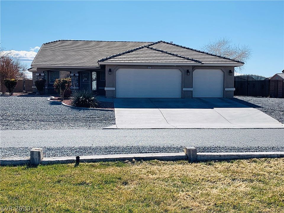 Beautiful home offers 1934 sqft,3 bed,2 bath,3-car garage,on a 1/3 of an acre, desert landscaped,fully-fenced backyard w/RV gate! Vaulted ceilings,open floor plan.Big living room w/wood burning fireplace,and formal dining area.RV parking with sewer dump.New blinds!Windows have solar screens. Both doors on garage have garage door openers.New hot water heater!Most of home has been freshly painted.Ceiling fans in all rooms.Easy commute to Las Vegas!