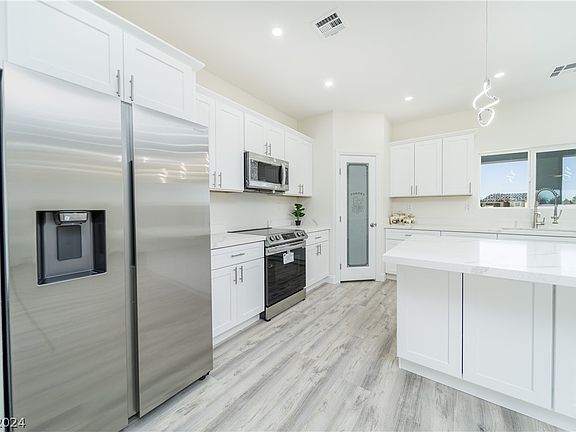 Absolutely Gorgeous, new build on an oversized CORNER lot CUSTOM home in the heart of Artesia at Hafen Ranch. This Beautiful Property is 2352 SQF with unique and open floor plan including 4 Large Bedrooms-2 Masters,3 Full Bathrooms, 3 Car Garage,Front Covered Porch,Covered backyard Patio, RV Parking with RV Connections.Home is fully upgraded featuring Custom Cabinets in the kitchen and all bathrooms, Quartz Countertops all around, under-mount sinks, oversized kitchen island with cabinets on both sides, Kitchen Pantry, New Stainless Steel Appliances, Extended Showers,5 1/2 inch modern baseboards, LED lightning, Ceiling Fans,Custom shelving in the closets, Water Resistance Vinyl Flooring all around, separate laundry room with a sink and cabinets, fully painted garage with epoxy flooring and so much more.The Property is fenced, RV GATE -opening, CUL-DE-SAC street and located in one of most highly desirable custom home communities in Pahrump. Close to SR 160. A MUST SEE!