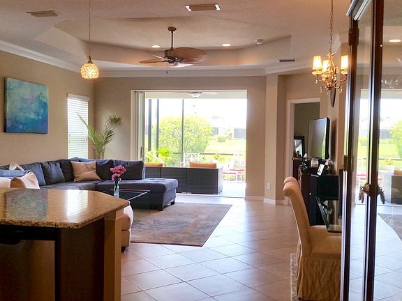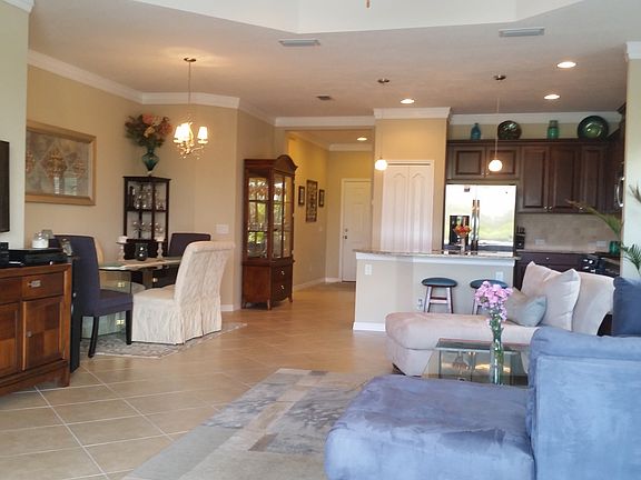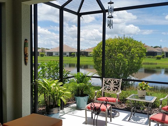 Beautiful "like new" villa on WATERFRONT lot in Fairfield. Relax in the extended screened lanai with open triple pocket sliding doors while enjoying maintainence free living (gas stub for grilling built in). Tidewater model is neutrally decorated with furniture negotiable. Crown Molding throughout great room, kitchen, master, foyer and den. 2 large bedrooms, 2 full baths, sunny den/office and open gorgeous kitchen with large granite center island. Kitchen features 36" upper wood cabinents with crown molding and under counter lighting. Stainless steel appliances (all included) gas oven, backsplash and pantry. Open floor plan with dining area and grand living room with coffer ceiling. Upgraded ceiling fans and dimmer switches in every room. Den/office includes upgraded glass french doors. Lovely Master suite with walk in closet, bath with dual vanities, upgraded cultured marble vanity tops and glass walk-in shower. Beautiful brick paver driveway and walkway with 2 car garage and utility sink. Construction is stucco on concrete block.