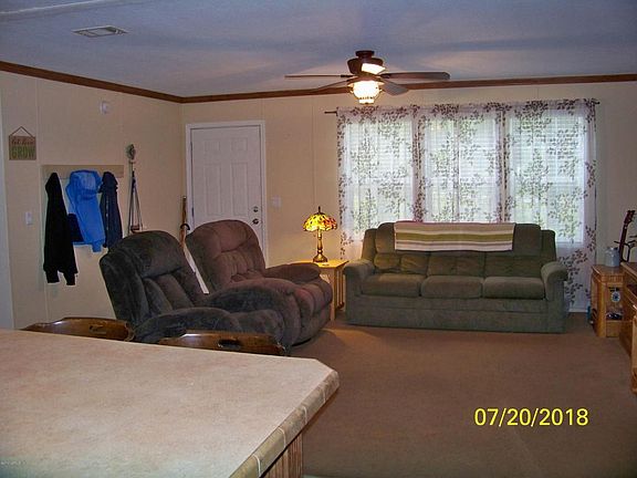 Lovely, like new double wide open concept, 3 bedroom/2 bath with an extra bonus room to use as an office/playroom. Plenty of room in the kitchen for a dining room table but enjoy the over-sized island for storage that comfortably seats 4. Brand new 3 Ton AC unit and refrigerator. Step out onto a beautiful 10 X 30 deck covered by a metal roof, enjoy the peace and quiet of the neighborhood while overlooking an above ground pool with a great deck, a jungle gym/play-yard, blueberry bushes and more. This property sits in a cul-de-sac with a 3 acre thick border of trees between it and a golf course on the other side. Half of the 2.02 acre well kept property allows room for a horse, cow, goats or other animals. Conveniently, there is an extra shallow well for gardening or power outages.