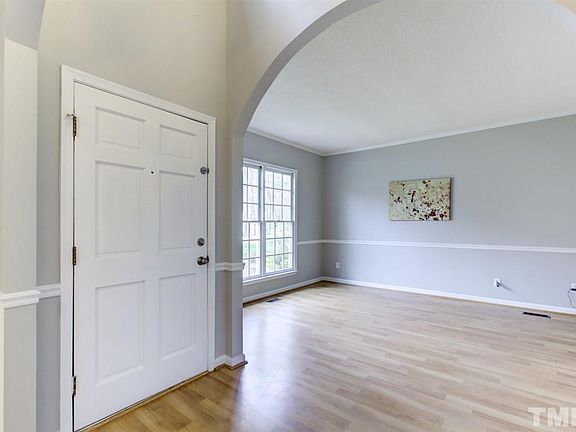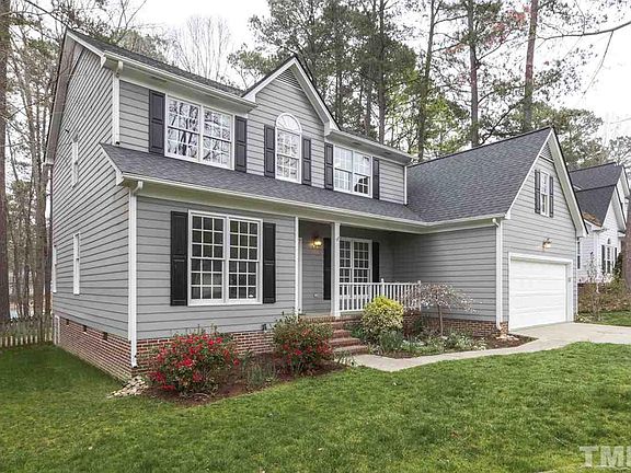Popular, 3-bedrm Harrington Grove home! Updated eat-in kitchen with white cabinets, white tile backsplash, granite, & stainless steel appliances + extra storage with floor-to-ceiling cabinets! Large family room overlooks deck & private, fenced-in backyard - backs up to woods & greenway! Just a few minutes to walk or bike to pool/tennis. Formal living room can double as office or other flex space. Vaulted master bedroom has a huge walk-in closet. Fresh paint throughout most of home and new carpet.