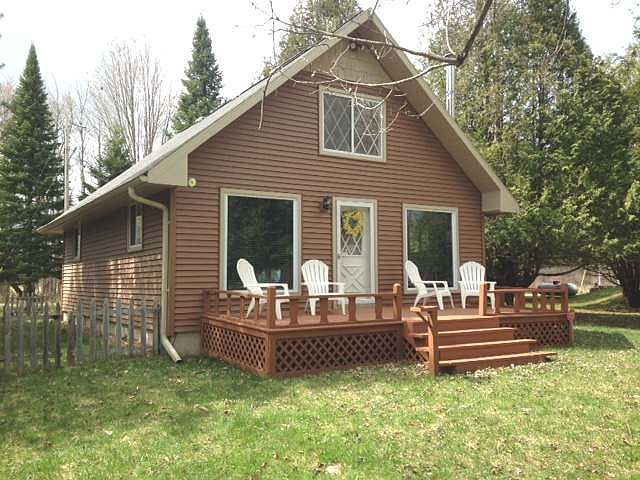 Very clean, maintenance free chalet on double lot on Cedar River. Main level master with large loft bedroom and catwalk to chalet peak with small reading nook. Great place to watch the river go by! Full bath main level with separate laundry/mechanical room. Half bath upstairs. Detached garage and also large storage shed. Improvements in 2010, Hi quality vinyl side/vinyl "shake" accents on all bldgs in garage & 6x10 potters shed. Landscaped, nicely treed lots with river winding by- Additional creek crosses thru lot N to S feeding into river.Gives off the babbling brook sounds & atmosphere with wild violets and other natural coverage.