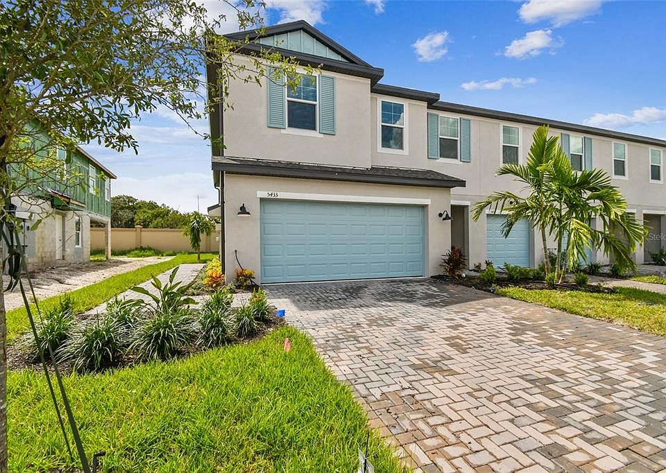One or more photo(s) has been virtually staged. Brand New Townhome with upgraded finishes. Welcome home to the brand new Sabal in The Palms at Trevesta. The Sabal is a spacious end-unit townhome and part of the first ever Smart Series townhomes from M/I Homes – Sarasota. Spread across 1,860 square feet, the Sabal features three bedrooms, two and a half bathrooms, a two-car garage and upstairs loft. Enter through beautiful landscaping right into the heart of the home. A half bath powder room is set to the side, while the main view is comprised of the kitchen, dining, and great room area. A chef's kitchen with beautiful cabinets and countertops, and well-appointed finishes, surround a center island with a double basin sink. A dining area lines one wall and opens into the great room with two large windows for cascading sunshine. Head out to the enclosed lanai with Florida nature views. You’ll love this special space for enjoying a morning cup of coffee or relaxing after a long day. Head upstairs where the loft, laundry room, and bedrooms reside. Two bedrooms share a full bathroom. The owner's suite is tucked towards the back of the home for extra peace and privacy. The spacious closet is a highlight, with enough space for clothes and added storage. Escape to the tranquil owner's bathroom where you'll have dual vanities and a framed shower enclosure.