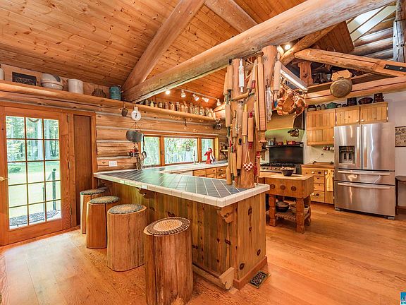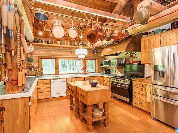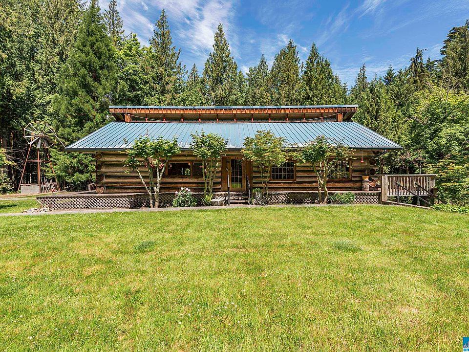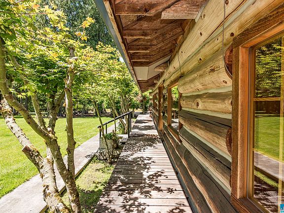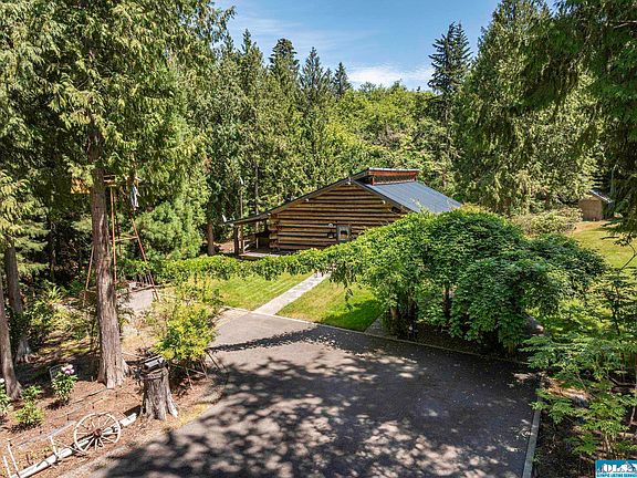 Picture perfect! Charming 2 bed/2.5 bath log home nestled on STUNNING 5 acres w/ irrigation creek, fern-lined ravine, large meadow, & beautiful cedar trees. Home has great room concept, vaulted ceilings & clerestory windows. Large kitchen w/ propane stove, copper hood & tons of counterspace. Fir plank T&G floors. French doors lead to wraparound deck w/ hot tub. 1,750 sq ft shop/garage in basement can fit 5 cars & comes w/ hydraulic car lift. Paved driveway, pressurized irrigation, full RV hookups. Must see!