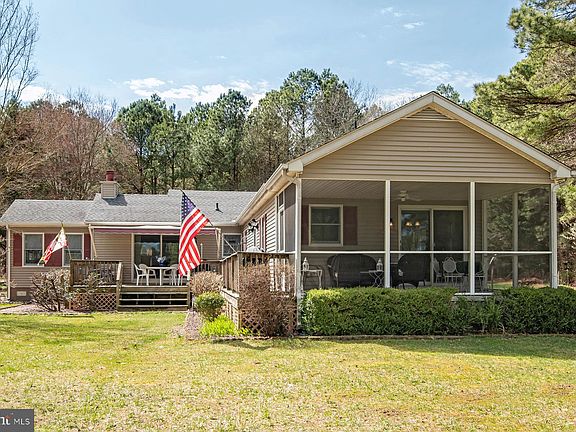 This charming waterfront home offers a peaceful retreat with stunning views of Irish Creek, nestled on 6+/- acres of private land featuring 200 ft. of shoreline. A perfect blend of comfort and low-maintenance living, this one level home includes 2 bedrooms and 2 full baths, making it an ideal choice for those seeking waterfront living with easy upkeep. The original home, built in 1995, was thoughtfully enlarged with a major addition in 1999, and two wing additions were concluded in 2017, offering ample living space. Inside you are greeted by the formal living room with fireplace and wet bar, a cozy sunroom perfect for guest overflow, and a master bedroom suite, which includes a small office and walk-in closet. Kitchen features new stainless steel appliances. Step outside onto the large rear deck with retractable awning, ideal for entertaining or relaxing while enjoying the tranquility and warmer weather. In addition to this outside living space, there is a waterside screened-in porch, located just off the kitchen. The dock, which is 5 feet wide, with recently replaced planking, provides easy access to the water for your boating and recreational activities. Whether you are looking to unwind or entertain, this home combines privacy, comfort, and effortless waterfront living in a truly serene setting. Fiber optic internet is available and the crawl space was recently encapsulated.