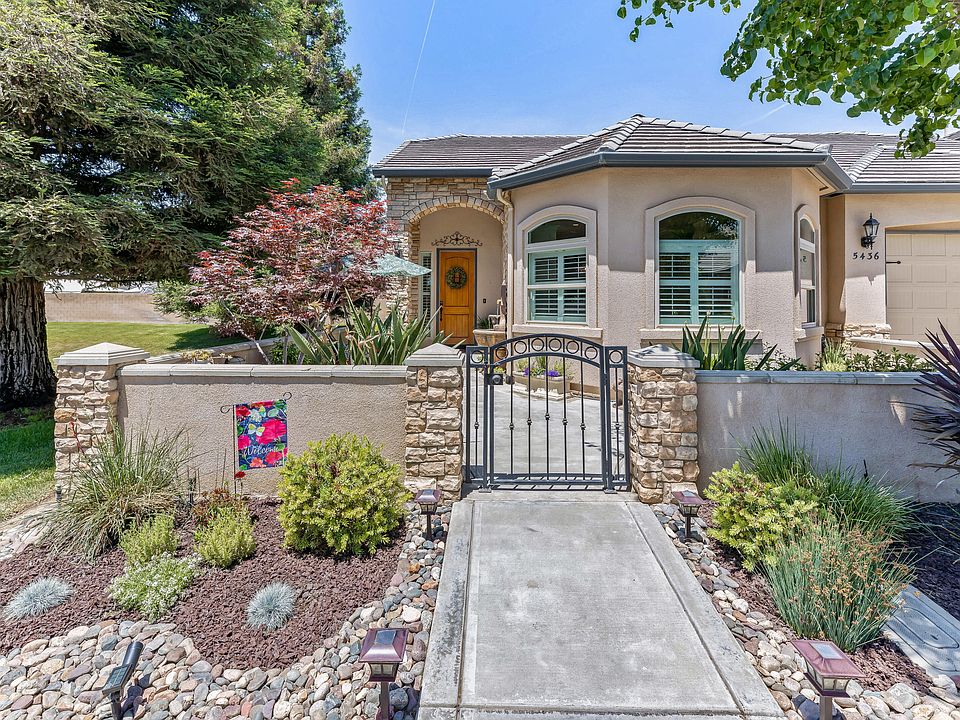 Exquisite, designer-perfect, move-in ready home in gated ''Turnberry''! Situated in SW Visalia, convenient to schools and shopping, this tastefully updated home is extremely well maintained and special. Custom landscape at entry courtyard with water feature. Entry with custom tiled art niche. Great room with fireplace, built-in bar storage and custom built entertainment center with storage and shelves. Chef's dream kitchen with breakfast bar, custom center island, Wolf gas cooktop, stainless steel Kitchenaid appliances, cabinets with pull-out drawers, and walk-in pantry. Kitchen also features gorgeous quartz countertops, custom tile backsplash, and dining nook. Custom details, including 10' ceilings, solid doors, all new fixtures and fans, and plantation shutters throughout. Luxurious master is a proper suite complete with jacuzzi tub, tile shower, his and hers custom vanities (24'' deep) and porcelain flooring. Additional bedrooms are spacious. Hall bath has stand alone vanity with limestone top and cast iron tub. Laundry room with skylight, loads of storage, utility sink and quartz countertop. 3 storage closets in hallway. Two car attached garage with stairs and loft storage area. Covered patio, and artificial grass in backyard. Custom landscape in front and back yards is manicured and beautiful. This home is incredibly tasteful - a true gem in SW Visalia. Call to arrange your private showing today!