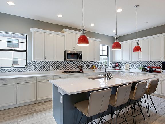Welcome to your spacious townhome in the highly desirable Alton Community, boasting a country club-style atmosphere without the steep price tag. This stunning 4 bedroom, 3.5 bathroom home also features a 2 car garage. The second level offers an impressive gourmet island kitchen with quartz countertops, gas cooktop, SS appliances, pendant lighting, and soft-close cabinetry. You'll also find a powder room, dining area, and great room that opens to a sweeping balcony, perfect for enjoying Florida living. The third level features a luxurious owner's suite with double sinks, quartz countertops, a large walk-in frameless shower, and 2 walk-in closets. Two guest rooms, a full bath, and laundry area complete the third level. The entry level bedroom includes a full bath and a walk-out patio that can be customized with an additional closet. Enjoy impact glass throughout and much more.