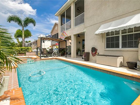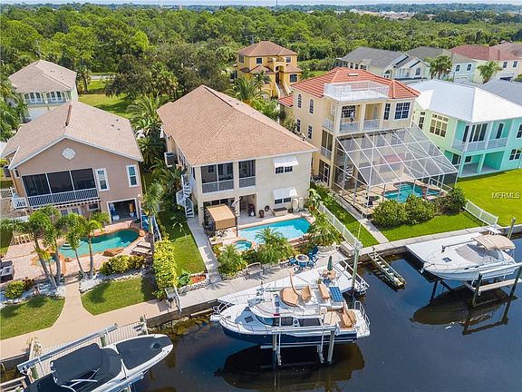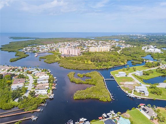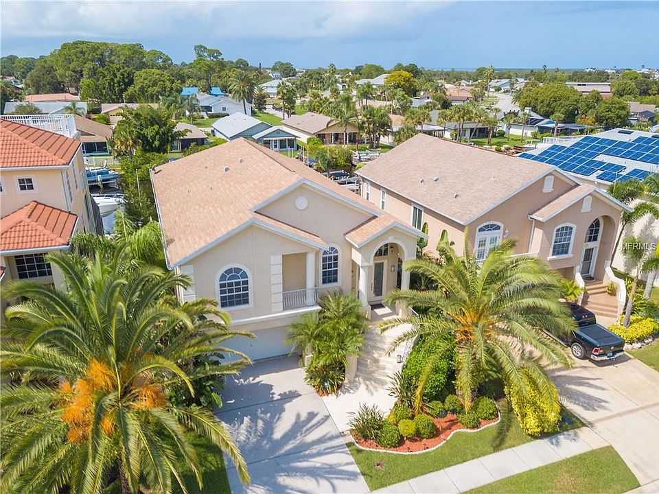 Stunning Sunsets featured nightly! Welcome to 5437 Jobeth Drive, a BEAUTIFUL waterfront home built in 2006 located in a newer subdivision of Gulf Landings. The entry welcomes you to the home with large French doors, a stylish foyer, & an elegant chandelier. The gourmet kitchen includes a center island, breakfast bar, Silestone counter tops, built-in smooth cook top,(could convert to gas) & a built-in microwave/wall oven combo. The center island has a bar sink with a built in wine rack & cooler. The large living room has a gas fireplace & access to a screened in balcony. The master bedroom has French doors leading to the same balcony plus two walk-in closets. The master bath includes an elegant double sink, a HUGE walk-in shower, & a separate jetted tub. The front guest bedroom features a small balcony overlooking the entrance. The home also features dual central air cooling systems & sprinkler system. Ground floor features include a 2 car garage with room for a trailer, workshop, & storage plus the bonus 1300 sf heated/cooled living space including pool bath, bedroom & rec room w/sliders to the lanai & pool. A spiral staircase leads from the balcony to the lanai & pool. The gas heated pool includes an infinity edge & hot tub. Boaters will love the large stationary, vinyl dock & 16,000lb boat lift (custom bunks & ladder do not convey). Access to the Open Gulf is just minutes away. Residents enjoy access to the private Gulf Harbors Beach Club for an additional required fee of $144 per year. Call today!