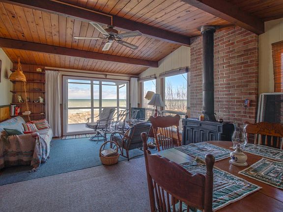 Lake Michigan 121' waterfront ''no bluff'' just walk out to the beach with a stream flowing along the north side emptying into the big Lake in front of the cottage. What a wonderful spot for privacy. Tongue & groove knotty pine walls and ceilings. Wood plank flooring in living room. Protected set back.