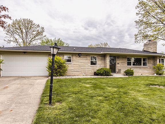 This Bedford stone ranch on a corner lot, where the rising sun casts shadows in the sunroom, welcomes you to Community Heights. This charming home boasts 2 bedrooms & 2 baths. Step into the renovated bathroom, adorned with modern finishes. The new flooring, inviting stone fireplace, & large picture window will be sure to grab your attention! Kitchen with breakfast room, built-in corner cabinets, a walk-in pantry and access to a private outdoor seating area is ideal for grilling dinner! Partially finished & dry basement offers a family room with a wood burning stove, large walk-in closet and bathroom. Don't overlook the 2-car attached garage, new roof, sewer line, and water heater. Walk or bike to Ellenberger Park and the Steer-In Diner. Quick I-70 access and 1 block from the newly renovated Community Hospital!