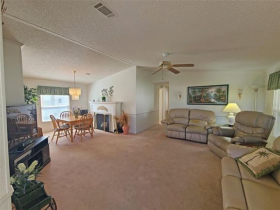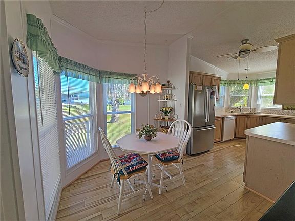 Under contract-accepting backup offers. Make your Florida winter dreams come true! This home is located across the street from Brownwood Paddock Square with no HOA fees. You get some of the fun of The Villages lifestyle without the extra costs. Walk into a open living space with a cozy breakfast nook in the front corner. Big windows let in tons of natural light. The kitchen has plenty of counter space and cabinets, plus a stainless steel French door refrigerator. The living and dining area gives you lots of room to arrange your furniture however you like. The primary bedroom is huge and runs across the entire back of the house. Double doors open to your private bathroom with two sinks, a separate room for the toilet, and a walk-in shower. The walk-in closet has built-in organizers to keep everything neat. There's also a nice second bedroom and a guest bathroom with an updated vanity. The laundry room is inside with a front-load washer and dryer that stay with the home. Step out the side door to your screened patio and storage room. There's another storage shed out back too. This home comes fully furnished as shown so you can move right in and start enjoying your new life. Please note this home will need a new roof and polybutylene pipe replacement. It's priced accordingly and is cash or conventional financing only. The home has solid plywood subfloors and is structurally sound. Plus, all of the windows have been replaced with double pane windows.