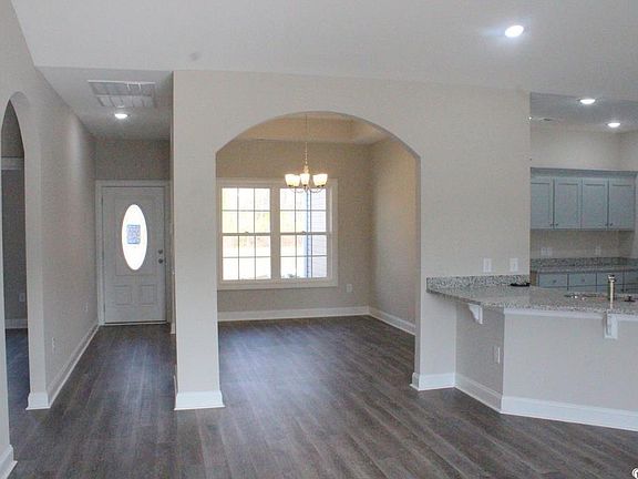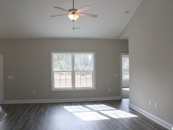 Enjoy peaceful country living in a convenient location. This Elm 4 bedroom home on a ½ acre lot has an open floor plan with split bedrooms for privacy. Front porch, entry foyer, dining room with double tray ceiling, the living room has a vaulted ceiling with fan. The kitchen has custom painted solid wood cabinets with crown molding and knobs, granite counters, a single bowl sink, black appliances, recessed lights, a counter height wrap around breakfast bar, walk in pantry, and breakfast nook. Glass sliders to the rear screened porch and adjacent patio. Private Main bedroom suite has a vaulted ceiling with fan, a bay window and large walk-in closet. The adjoining bath has a 5 ft walk in shower, linen closet and raised height double bowl vanity. Luxury Vinyl Plank flooring through the foyer, dining room, living room, hall, bedroom 2, kitchen and laundry. Vinyl in the bathrooms and carpet in the other bedrooms. 2 car garage, completely finished, painted, with automatic door opener and pull down stairs to attic storage above. Cheyenne style interior door, RB3 window and door casings, smooth ceilings, landscaped yard with irrigation system, gutters, 30 year architectural shingles. Low maintenance energy efficient new home. Close to downtown Conway, Riverwalk Park, great dining and shopping, within 25 minutes of the beach and excitement of Myrtle Beach. Video is for illustrative purposes only and may be of similar house built elsewhere. Square footage is approximate and not guaranteed. Buyer is responsible for verification.