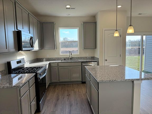 Benton stone gray cabinetsBlanco perla granite countersFull front porchPendant lightingStainless gas appliancesCountertop backsplashExtended great room