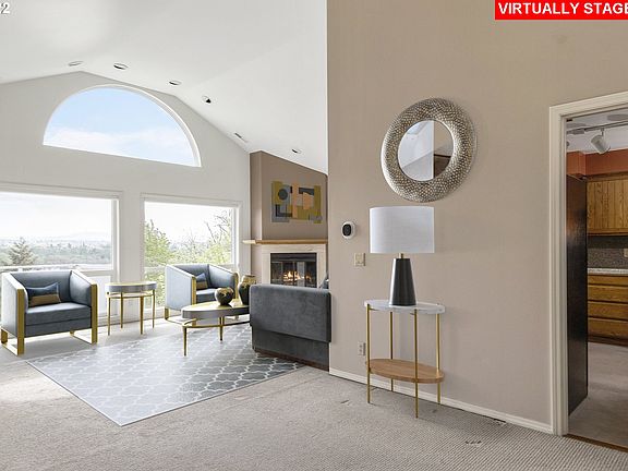 Views of Hood & the Willamette River from this spacious John's Landing Condo. This upper unit has vaulted ceilings, large windows, wood fireplace & lots of natural light. Solid surface counters in kitchen, tile floors. New tile flooring & vanity with quartz counters in primary suite. New carpets in both bedrooms. Retractable awning on balcony. Garage AND covered parking. Exterior envelope, paint, doors:updated in 2016.