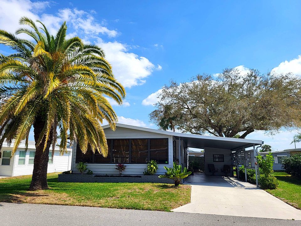 A very unique, open concept renovation! Freshly painted with cool, calming colors throughout the home and the custom touches and accents make this home stand out from others. There is a new TPO roof with transferable warranty, 2017 HVAC, new laminate and tile flooring, new lighting and all cabinets and countertops have been recently refinished. There is a fabulous fenced garden oasis in the back of the home with carefree artificial grass, attractive landscaping, quality outdoor furnishings and an area for a gas grill. You'll love spending time in this private, peaceful space. This is a 2 bed/2 bath with cathedral ceiling in the living area and in the open Florida room with air. A very spacious home with rare entry foyer and extra-wide hall perfect for putting your own coffee bar to share with guests. The living room has an attractive shiplap accent wall and furnishings will include couch and loveseat, designer coffee table and 2 end tables. To the side the owners have placed a pool table which can remain or this is a perfect place for a dining table and chairs. Note the oriental screen pictured will not convey. The home is open to a large tiled Florida room is lined with jalousie windows, lighted ceiling fan and window unit A/C if needed in extreme months. The two recliners, end table, TV stand and 4 bar stools can remain. The kitchen is equipped with newer appliances and great for entertaining with a new large bar top overhang open to the floor plan and there is plenty of cabinet space plus a reach-in pantry. Attractive glass tile backsplash and custom wall shelving add the finishing touches to this room. King size master bedroom is ready for your furnishings and personal touches. A oversized walk-in closet is organized with wire shelving offering plenty of space for clothing, shoes, purses, etc. The tiled en suite has double sinks, step-in shower, comfort height commode, linen closet and medicine cabinet. Guest room easily accommodates the queen bed which can remain and there is a walk-in closet. The tiled second bath has a nice subway tile wall surrounding the vanity, a tub/shower combination and comfort height commode. The home is nicely landscaped and easily cared for. A one-of-a-kind custom lattice on the carport provides privacy and the driveway will easily accommodate 2 cars. The utility shed houses the washer and dryer and there is wire shelving for your additional storage needs. Camelot Lakes is a premier resort style, gated 55+ community where your monthly lot rent of $1487 includes water, sewer, trash/recycling curbside pickup, lawn maintenance, taxes and endless upscale amenities and organized activities. There are 2 beautiful lakes with fountains and paired swans and we're told, some king size bass! All shopping needs, great restaurants, hospital and entertainment are just minutes away via quiet back roads or easy I-75 access. Tired of having everything at your fingertips? Take a 7 mile drive to the beautiful white sand beaches of Siesta Key. Throw out a line, take a dip or enjoy an energizing walk along the shore. A never ending supply of fresh air, sunshine and some of the nicest people you'll ever meet. Luxury living at the lowest cost in Sarasota! Exclusive and shown by appointment only.