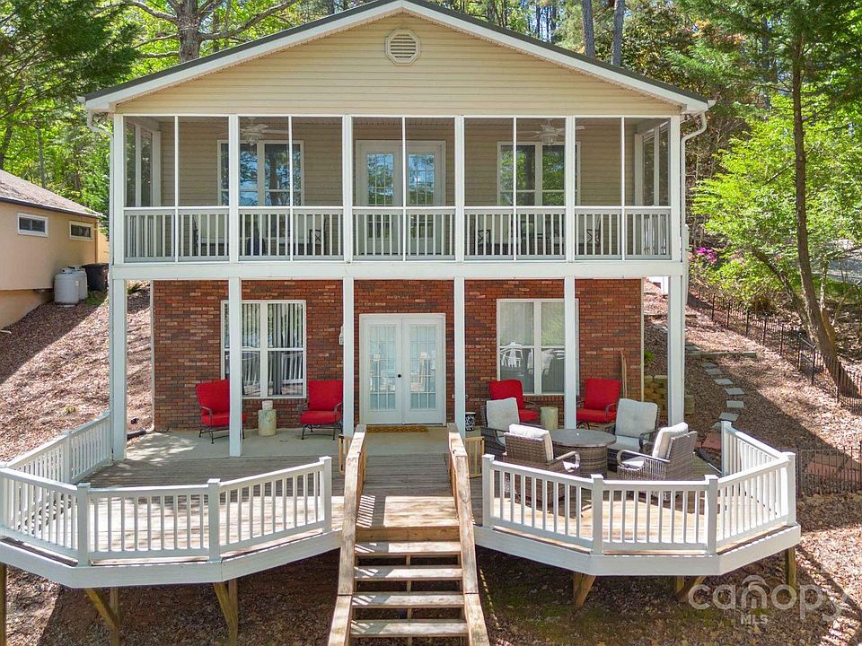 Nicely furnished waterfront home nestled in the trees that provide glorious shade! Fantastically deep, deep water & large 2-Slip Boathouse w/ personal watercraft lift. Full open sundeck on top perfect for sunbathing. This floorplan features a beautiful open great room, kitchen w/ painted cabinetry & center island, dining area with beautiful lake views, and a large screen porch looking over the lake! Primary bedroom & large full bath with garden tub and separate shower located on the main floor! Downstairs in the finished basement, you have a nice size bedroom and a bonus room to use any way you'd like and another full bath. The tall ceilings gives the basement a lovely open & airy feel! Nice den with lots of windows and glass doors that connects to a beautiful covered patio and two open octagonal decks that flank each side of the walkway leading directly to the waters edge. Just a fantastic setting, with a wonderful view of the lake. New HVAC, New Sea/Shore Wall, Metal Roof Aprox 2018