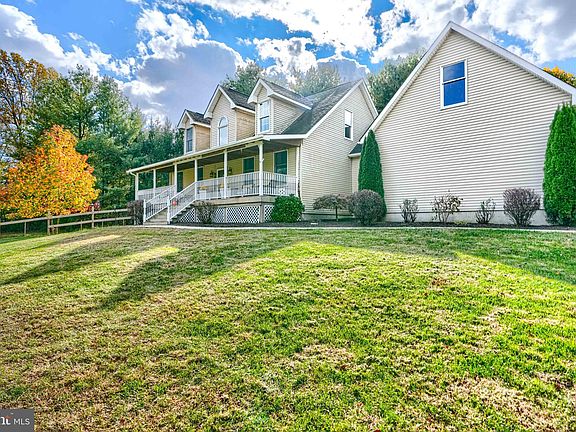 Spectacular Cape-cod with main level bedroom and bathroom, laundry and additional half bathroom, large living room and formal dining room, kitchen and breakfast room. Nine foot ceilings on main level and two-story foyer. The second floor features two large bedrooms and a full bathroom. The full, unfinished basement has a walk out to the partially fenced yard. Large front porch, large deck and oversized garage on 2 acres. Garage is heated with propane, tank is leased. This is an estate sale and does need some TLC and is being sold AS-IS. Loads of potential! Long driveway to a private setting, backing to trees.