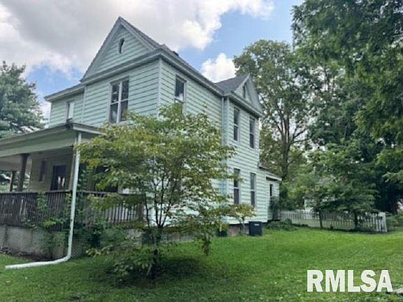 Large home with very pretty woodworking and stained glass windows. Two fireplaces and a galley kitchen plus an extra room joining it. The yard is fenced and garage is two car. 4 bedroom and a bath and a half, laundry on first floor.