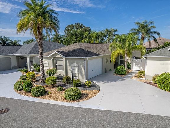 This beautiful courtyard villa is partially furnished with many turn-key items PLUS a GAS Golf Cart. It offers a great location, upgrades, privacy and an enclosed lanai for year around use! Incredible area and neighborhood convenient to pool, recreation center, shopping, restaurants and more! This highly desirable home offers 3 bedrooms, 2 bathrooms, wood laminate flooring, granite counter tops, crown molding, stylish wood cornices above windows, plantation shutters, pendant lighting & enhanced fixtures. The open concept is perfect for entertaining and family visits. The light and bright kitchen includes large breakfast bar with tile enhanced wall, overlooking dining and great room, some newer appliances, deep sink, inset lighting, tiled backsplash & maple cabinetry. Dining area flows easily to the great room and the enclosed lanai beyond. The lanai windows slide open for those gorgeous Florida days! Diagonal tile flooring warms up the room! The master ensuite is tucked away and guest bedrooms are separated for privacy. The indoor laundry room with utility sink is a game changer! The outdoor area is beautifully landscaped with plenty of concrete and a very small portion of grass which makes it pet friendly! Three sets of glass sliding doors provide access to the private courtyard from anywhere in the home. This home is perfect for year around living or a vacation home! The Villages Lifestyle is at your finger tips! Enjoy golf cart accessibility to all of your favorite spots! Schedule your private showing now!