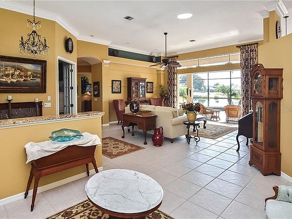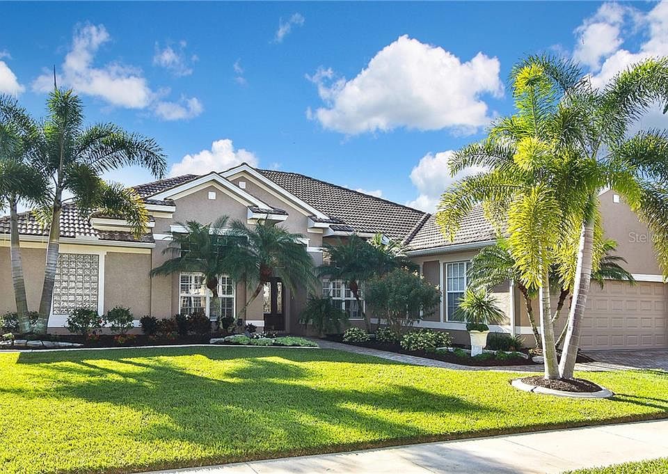 This stunning and immaculate three bedroom, three bath home with large den will enthrall you as soon as you arrive. Meticulously maintained and updated with paved driveway and walkway with lush colorful landscaping. Walk through the beautifully etched glass front door to the remarkable view of the lake, golf course and preserve. Featuring a screened and solar heated pool located in the spacious covered lanai, this is the perfect place to enjoy a quiet evening with the gentle sound of the pool waterfall. The lifestyle we all dream of! All tile floors, recessed lighting as well as plantation shutters in most rooms. The open floor plan offers a lavish formal living and dining room with plenty of space to entertain. The delightful eat in kitchen boasts an abundance of cabinet space with stainless steel appliances as well as a breakfast bar. Split floor plan. Large master bedroom with double walk in closets that include built ins. Master bath has dual sinks and a luxurious walk in shower. Jack and Jill bath between 2nd and 3rd bedrooms is convenient for your guests. The over-sized two car garage includes a generous amount of built in cabinets. Sawgrass is an environmentally friendly community that includes a very active and busy social calendar. In addition, there is an exercise room and clubhouse where you can enjoy exercise classes, golf, tennis or pickleball. Great place to bike! A short drive to the shops and restaurants on Venice Island as well as the beautiful pristine Gulf beaches.