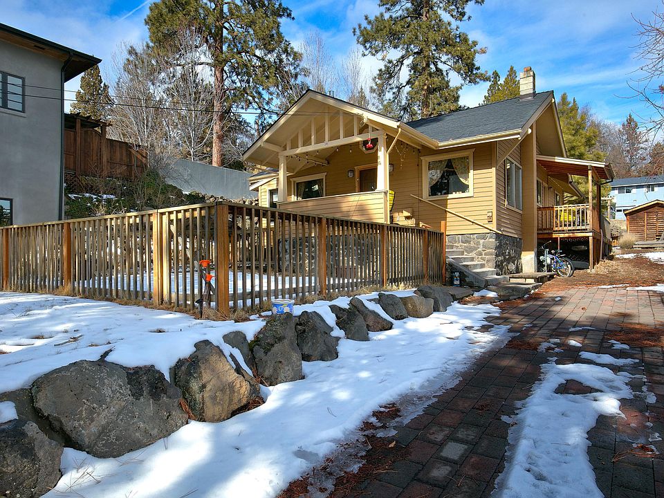 Charming single-level bungalow nestled in the heart of NW Bend in the River West neighborhood. Enter through the covered front porch into the main living area. Relax around the beautiful brick hearth and gas burning stove. The galley kitchen optimizes the space with an abundance of storage and work areas. Spacious dining area complete with large picture windows. Work from home in the bonus office space area off of the living room. Skylights provide lots of natural light throughout. Covered front and side porches provide the perfect outdoor living spaces. Fully-fenced front yard and back yard with small dog run. Sizeable storage shed is the perfect place to store your bikes, skis and gear for all of your Central Oregon adventures. This quarter acre lot has potential for an ADU. Ideally located for endless adventures: close to downtown, Galveston corridor and the Deschutes River Trail.