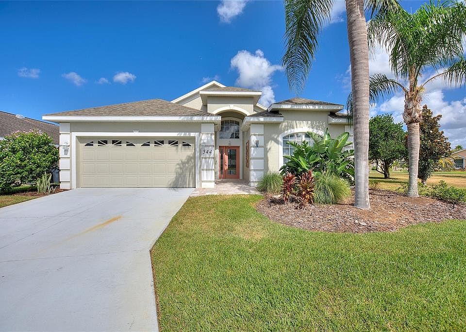Ever popular RidgeDale 2/2/Den model with a 300+ SF west-facing screened lanai with roll-down sun shades on a nearly 1/4 acre premium corner lot, located 0.3 miles from the private High Vista 55+ community clubhouse and outdoor amenities. Full-view privacy glass front door and sidelight and overhead domed transom window allow light to flow freely through the great room with a 12 FT ceiling and porcelain plank floor to the wall of 8 FT lanai patio doors. Eat-in kitchen has granite, solid wood cabinets with under & over lighting, tile backsplash, breakfast bar and skytube. Primary bedroom has cathedral ceiling, french-door to lanai and a full private bath with updated shower, double sink vanity, water closet, walk-in, storage & linen closets. Split bedroom design offers a cozy guest area with adjacent linen closet and full bath. Nestled between bedrooms is the den with double door access from great room. Corridor access laundry room with washer, dryer and overhead cabinets has storage closet and utility sink. Wi-Fi thermostat, Orbit Wi-Fi irrigation control. Garage has RainSoft whole house water treatment system, Lifestyle garage screen door, ceiling fans, workbench, pull down ladder access to attic, MyQ and keypad entry. Levolor window treatments, bull nose corners, brushed nickel paddle handles and hinges, newer smoke detectors throughout. Roof replaced 2022. 5-zone irrigation valves replaced 2022. Lanai screens replaced and interior painted 2021. Bathroom updates include water saving class 4 flush Kohler toilets and high-volume bathroom ventilation fans. Ridgewood Lakes is a golf cart friendly community. Sold As-Is. $220 monthly High Vista HOA fee includes Spectrum internet and basic cable TV with 2 cable boxes, lawn mowing and exclusive access to resident-owned 12,000 SF private clubhouse and amenities. $435 semi-annual Ridgewood Lakes HOA fee provides 24x7 staffed security gate and master association-owned private road maintenance. Adjacent to 18-hole White Heron Golf Club with restaurant, privately owned and open to the public. High Vista is a 55+ community with outdoor heated pool and spa, fitness center, library, pub & many organized activities. Pickle ball, tennis, bocce and shuffleboard courts. Miles of biking and walking trails within Ridgewood Lakes gated community. Shopping, Disney, Universal, Orlando & Central FL entertainment nearby, easy access to I-4, medical facilities, airports & Sunrail Station. Advent Health hospital is 3 miles away.