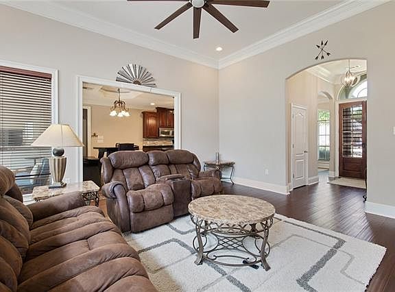 Crown molding throughout. Floor-to-ceiling fireplace, custom built-ins. Abundant ceiling fans everywhere. Rich custom kitchen features brick flooring, dark wood cabinets, and granite counter tops. Private master bath has a built-in garden tub, separate shower, and generous his/hers vanities. Huge master closet. Screened porch for outdoor entertaining. Storage shed. A gated subdivision with a community pool. Flood Zone X.
