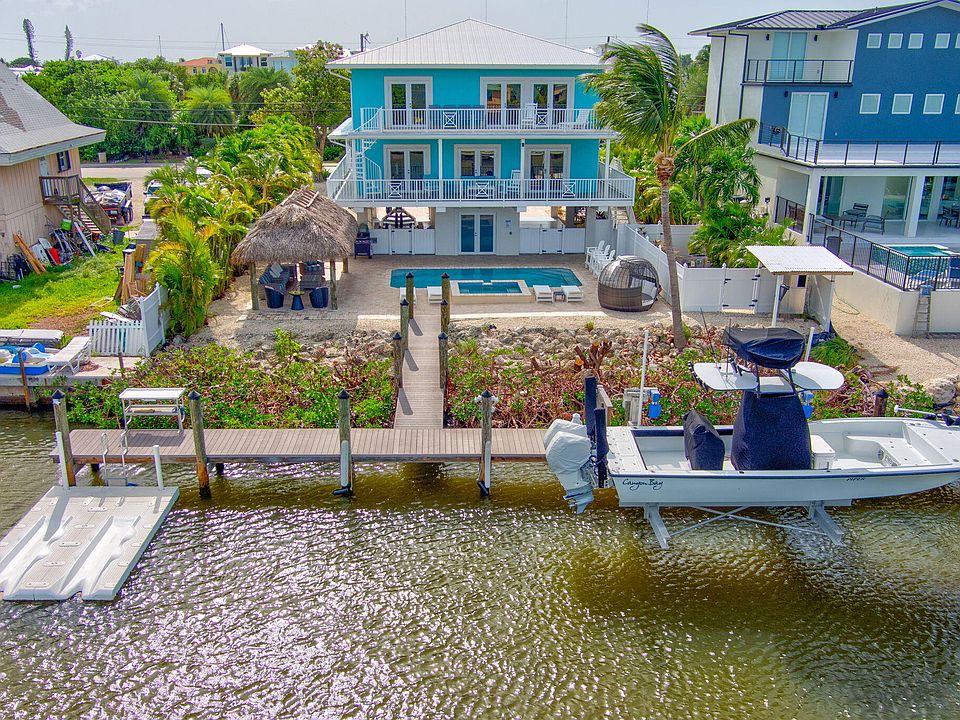 Welcome to Paradise Cove! The perfect vacation home and proven rental property. This fabulous waterfront home has beautiful ocean views, tropical pool and spa, tiki hut, fully outfitted dock, & is only a 3/4 of a mile to Sombrero Beach. This is the ideal private getaway and investment property. Enjoy the large dock with a 14k lb boat lift, fish cleaning station, and ice machine. The first floor has a spacious living room, chef's dream kitchen, and a breezy balcony with views of the pool, canal, and ocean. Off the living room are two bedrooms with a shared bathroom - one with a King-sized bed and one with two trundle beds (4 twins). Additional half bath and laundry room are also off the kitchen. Upstairs, the oversized master suite with sitting area, private balcony with ocean views & luxurious ensuite bathroom are your personal retreat. Additional large bedroom for guests with a private bathroom and a walk-in closet are on this floor as well as a large bonus/game room with a wetbar. This property has the perfect location with all the conveniences and beautiful Sombrero Beach, ranked one of the best beaches in the Florida Keys, less than 1 mile away. Plenty of parking with two covered spaces and room for a boat trailer and RV also. Large downstairs storage area for all your gear with fridge and freezer and separate owners' area. Home is being sold fully furnished and outfitted, down to the kayaks and wine glasses. Significant investment was made to turn this perfect personal home into a proven turn-key rental property with all safety and security measures and owners locked storage spaces. It is fully stocked for all items for babies to teens to adults to have the perfect getaway. Recently, the extra wide (100') canal was dredged to 5' to allow for larger boats and easier access. Insurances: Wind $6,594, Flood $710; 2022 Rental Income Info available upon requestMotivated seller!!