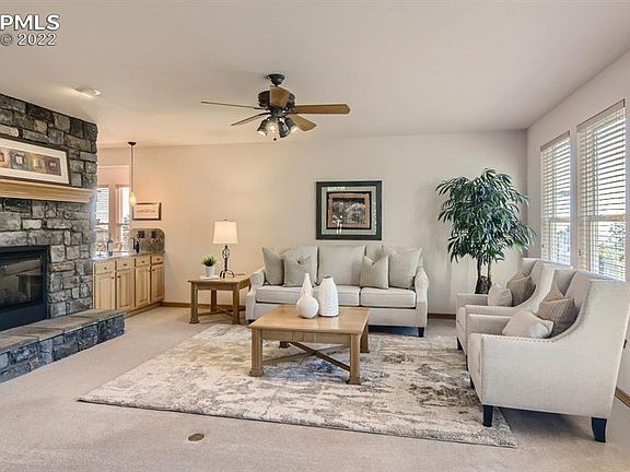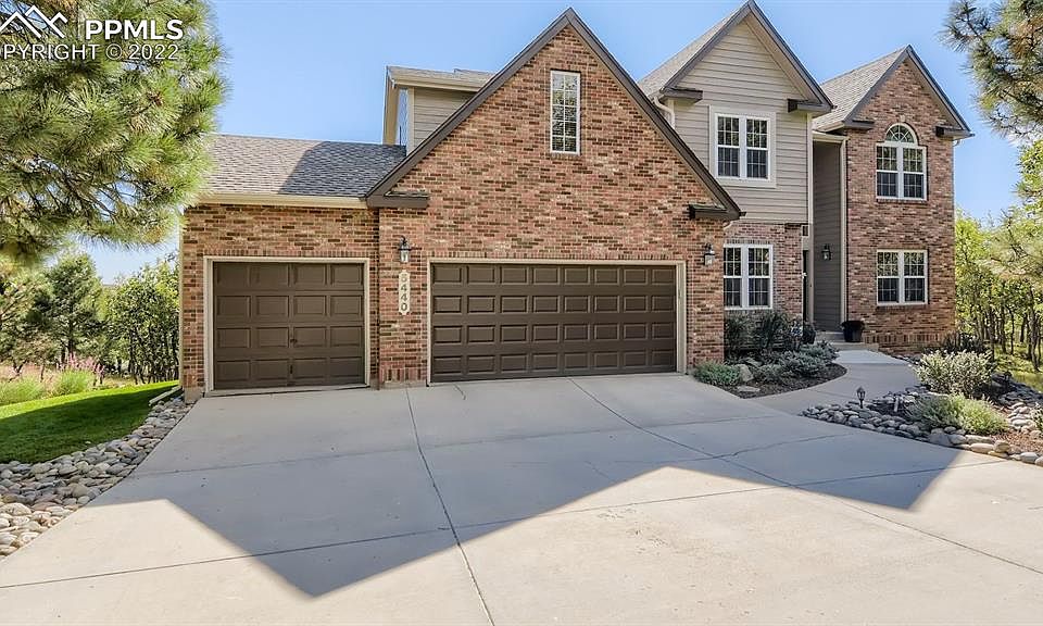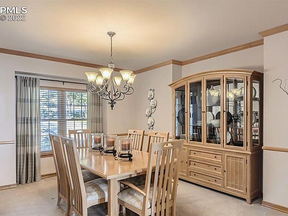 This pristine single-owner home is located in the exclusive Spires neighborhood in highly desired school district 12. Perfectly located just North of the Cheyanne Mtn. State Park and East of 365 acres of open space. The property is perched on a secluded flag lot surrounded by teeming abundant wildlife and mature landscaping. Centered on an oversized, half acre lot, city and/or mountain views can be seen from the large maintenance-free deck and every window in the home. At night the home is illuminated by subtle yard lighting leading to the front entry. The home includes abundant storage including custom shelving and easy attic access. There are dual AC and gas furnaces as well as an attic fan and two fire places to keep the home comfortable no matter what the temperature is outside. The elegant master bedroom boasts a gas fireplace, large sitting room perfect for reading or relaxing and en suite 5 piece bathroom with heated floors. The gorgeous kitchen has a double-sided fireplace and includes granite countertops, numerous cabinets, six-burner gas stove, oversized double wall ovens, custom built-in microwave and bar sink perfect for entertaining. The spacious walk-in pantry off the kitchen provides room for all your cooking accessories. A dedicated office located on the main level adorns beautiful glass-panel double doors making for the perfect home office space. The upstairs has three large guest bedrooms all with en-suite bathrooms. The lower level has a super-sized laundry room with numerous cabinets and large closet. The lower level offers walkout access to the large concrete patio leading to the beautifully manicured lawn and garden. Minutes from parks, hiking, Cheyenne Mountain State Park, shopping, dining, Downtown, Hwy 115, I-25 and Fort Carson. You won't want to miss this one of a kind beauty!