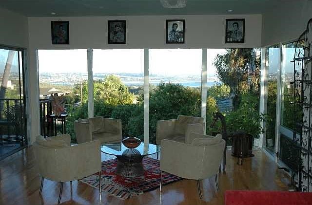 Stylish hillside loft-style contemporary home with Asian art and panoramic views of Mission Bay and city. Four bedrooms 3 A baths two offices family room living room dining balcony patio with fountain deck with gas grills and smoker garden with fountain and fruit trees security alarm system. Fully furnished including very well-equipped kitchen for people who love to cook. Home of two UCSD professors. 3790 sq ft