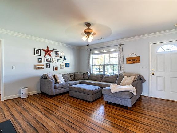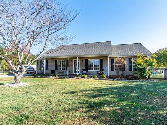 Welcome home to tranquil countryside living nestled on a cul-de-sac lot. Spacious split bedroom plan w open & bright living space & dining area offers both comfort & style. Kitchen boasts updated stainless appliances, backsplash, breakfast bar, & large pantry. Luxurious primary suite w walk-in closet, soaking tub, separate shower & dual vanities, two additional bedrooms provide extra space for guests. Laminate & tile flooring, crown moldings & ample closets are just some of the custom details. Covered front & back porches are great for enjoying the outdoors & expansive fenced back yard with courtyard area is perfect for entertaining friends & family. Storage room & wired storage buildings & oversized Dual car driveway. Exceptionally well maintained & Updates include HVAC, Water heater & appliances! Located just a short drive to Greensboro, Asheboro, Burlington & Liberty. No HOA! Call for your private tour today!