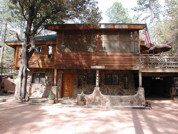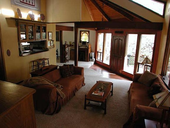 Fantastic 2-story home w/ genuine flagstone & redwood siding & redwood decking. Insightful mixture of carpet & vinyl floors and generous amounts of wood trim, beams, and window casings give this home a comfortable elegance. Vaulted ceilings, numerous windows allow for ample light into this wonderful home. Other custom touches include beautiful stained glass over entry, solid wood kitchen cabinets, solid wood doors, beautiful landscaping, gorgeous decking and a cozy courtyard area, as well as a beautiful guest apartment over the 2-car garage. The home is attractively placed on over an acre of tall Ponderosa Pines. Very secluded and private.