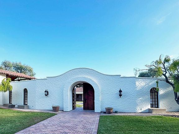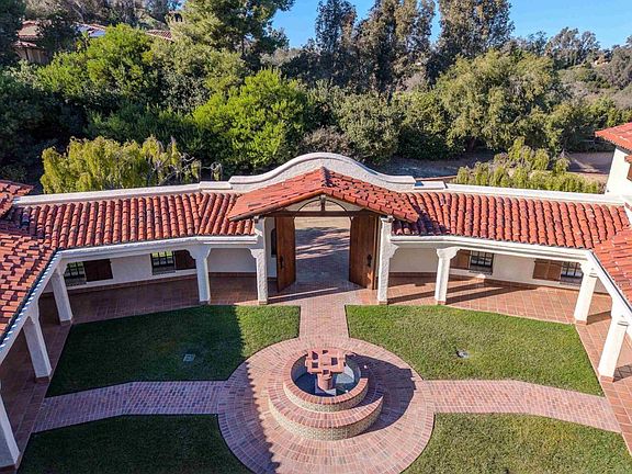 Ralph H. Reisinger-designed 1994 Spanish hacienda, single-owner, never remodeled, original condition. 4 BR | 3.5 BA | 3,774 sq. ft. Classic U-shaped plan centers on a tiled Cantera fountain courtyard. Deep covered arcades wrap three sides with banks of French doors opening from nearly every room. Saltillo tile floors indoors and out. Exposed beam ceilings, arched doorways, barrel-arch passageways, four fireplaces (two-sided living-dining, family room, primary). Primary wing: bedroom with fireplace, sitting room, walk-in closet, en-suite + adjacent private study with separate courtyard entrance. Guest wing: Two ground-floor bedrooms and a second-story casita with full bath and large loggia overlooking courtyard and southern valley. Covered outdoor kitchen/grill in arcade. 3.18 gently sloping acres with mature gardens, eucalyptus, citrus, lawns and room for guest house, pool, tennis, stables or vineyard. Deep drive-through garage. Authentic Cliff May-inspired Covenant hacienda with expansion land.