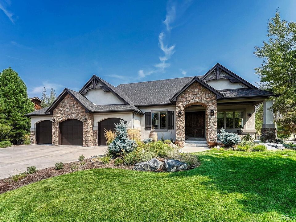 Dont miss out take advantage of this extremely rare opportunity to live on one of the most highly desirable streets in The Timbers Neighborhood. This home was custom built by Summerwood Homes, also one of the most highly sought after builders in The Timbers. This beautiful ranch home is the perfect layout for daily life and entertaining. The centerpiece of the family room is the grand stone fireplace and hearth. The chefs kitchen, with beautiful knotty Alder cabinets, is perfectly outfitted with a professional grade 6 burner gas range and a stainless Decor hood vent. The butlers pantry, the perfect staging area for your dinner parties, flows into the large dining room which can accommodate all of your guests. The private master suite is the perfect place to end your day. There is a private access door to the deck and a warm fireplace for cold evenings. The main floor office doubles as a possible extra main floor bedroom, connected to a bath. You wont want to miss an opportunity to enjoy the outdoors on the private covered deck complete with BBQ grill. The basement includes 3 additional bedrooms, a recreation room and a full built-in-bar in the media room. The lower patio is another option for outdoor enjoyment with an included salt water hot tub. While perusing this home, take time to notice the stunning finishes which include the rich wood trim, hickory wood floors, extensive knotty Alder paneling and the stone accents that match the exterior. This home is everything you would want in a Colorado Mountain Contemporary Home. Seller says many items of furniture are for sale as well. Measurements are approximate and for advertising purposes only.