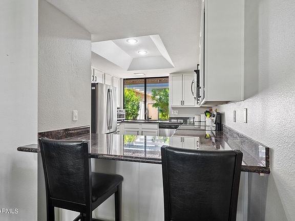 Gorgeous patio home at quiet cul-de-sac's end in Sunrise Villas. Enjoy front and back patios in a park-like ambiance. Dramatic entry through a private courtyard. Upgraded kitchen with custom cabinetry, granite counters, and modern appliances. Spacious living area with high ceilings and abundant natural light. Master bedroom boasts a large bathroom and walk-in closet. Guest bedroom overlooks the courtyard. Adjacent to lush community greenbelt with expansive lawns and mature trees. Sunrise Villas amenities include 4 pools, jacuzzis, tennis and pickleball courts, and trails perfect for the social type. Ideal location for exploring Scottsdale's offerings.