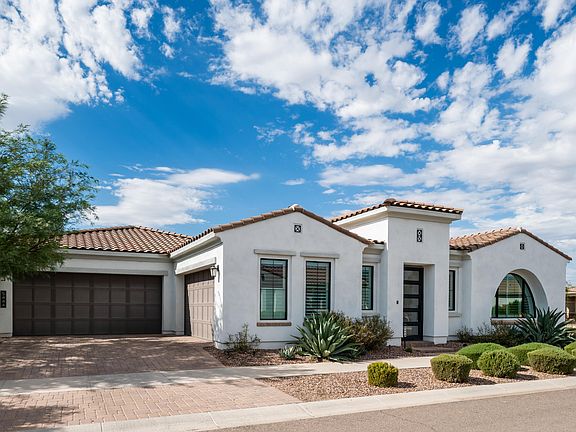 Step into the epitome of luxury when you enter this 3721 sqft, 3-bedroom, 3.5-bath home. Extensively upgraded with high-end luxury finishes, this home features an unmatched, stunning aesthetic. Situated on a corner lot and backing to an open green space, you'll enjoy sunset views and the privacy of having only one neighbor. The large, fully enclosed front courtyard and main home entrance are adorned with iron and glass doors that allow light while still providing privacy. A professionally appointed gourmet kitchen awaits, complete with built-in Thermador appliances, including a 48'' side-by-side refrigerator, dishwasher, gas range with double ovens, additional wall oven, and microwave. Impress guests with the oversized island dressed with waterfall-edge quartz, back to back cabinets, high-end pendant lighting, deep sink by Kohler and KitchenAid Beverage Fridge. Valet area from kitchen to garage can be used as butler's pantry or additional storage. A large walk-in pantry offers the ultimate in organization, featuring custom roll-out bins, baking pan storage, and pull-out drawers. The Relaxing primary retreat features custom lighting & drapes, 72" soaking tub, spa-like shower, heated towel rack, and custom-designed closet. Ensuite bedrooms and a game room with private access to the courtyard provide the perfect setup for Multi-Gen living. Keep as is or convert into a full Multi-Gen suite. A home office/flex space is complete with custom-built-in shelving, drawers, and elegant sliding iron and glass doors. Two large living spaces provide both formal and relaxed options and include 12ft coffered ceilings, a temperature-controlled gas fireplace, and custom lighting from Rejuvenation Lighting. A 20-foot sliding glass wall and continuous wood-look plank tile flooring flow from the living room to the patio, beautifully uniting indoor and outdoor spaces. Host backyard BBQs with style and elegance in this highly appointed backyard oasis. Enjoy relaxing under the covered patio by the ambiance of the outdoor gas fireplace. Dine al fresco with friends and family under the pergola with your outdoor kitchen featuring a Coyote grill, mini-fridge, beverage center, sink, and high-grade granite countertops. Relax year-round in the luxurious heated pool and spa. Fully insulated 4 car garage includes EV charging outlet, utility sink, full home H2O Concepts water filtration system, storage shelves, tankless gas water heater, epoxy chip floors, and additional 12x14 storage area w/ tv and ceiling fan prewiring. This entire home is equipped with 12,700K Tesla Solar and smart home app control capabilities for multiple home functions. Be sure to see the full list of this home's many upgrades and features in the document section of this listing. Located in the private gated enclave of The Estates at Eastmark, residents enjoy a private clubhouse w/ pool, firepits, a lounge area w/TV's, and kitchen for hosting events. Connected to the Eastmark Great Parks, you will enjoy the splash pad, play structure, lake with riparian stream, event pavilion, open fields, paths, trails, skate park, 18-hole disc golf course and so much more. Eastmark has several highly rated school options for all grade levels and a new 30,000sqft library. Located close to shopping, dining, Queen Creek Village, Legacy Park, Mesa-Gateway Airport, the 202 freeway and scenic Canyon Lake.