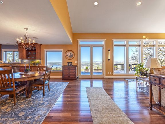 Welcome to your own private sanctuary perched above The Dalles, where breathtaking views of the Columbia River, cherry orchards, and rolling hills stretch out in every direction.Built in 1990, this thoughtfully designed single-level home offers a seamless blend of comfort, style, and nature’s grandeur.From the moment you step inside, you’ll be captivated by expansive picture windows framing panoramic vistas that transform with every season.The open-concept floor plan, vaulted ceilings, and abundant natural light create an airy and inviting space—ideal for both quiet mornings and lively gatherings. Whether you're sipping coffee at sunrise or relaxing in the evening glow, every room on the east side offers front-row seats to the ever-changing Gorge.With 3 spacious bedrooms and 2 full baths, this home is perfect for anyone seeking single-level living without compromising on space or elegance. The kitchen serves as the heart of the home—ideal for cooking while staying connected to the conversation.Step outside and experience what makes this property truly unforgettable. A massive deck stretches across the back of the home, offering a front-row seat to sweeping views and unforgettable sunsets.Soak in the hot tub as eagles soar overhead and deer pass through the surrounding landscape. Host summer barbecues, stargaze with friends, or simply take in the stillness and natural beauty that surrounds you.Set on a quiet rural parcel just minutes from town, the property also features two detached two-car garages and a spacious RV barn—ideal for all your hobbies and adventures.This home has been a beloved gathering place, a peaceful retreat, and a launching point for outdoor adventures. Its welcoming spirit, unmatched setting, and timeless charm make it a rare opportunity to own a piece of the Gorge’s magic.