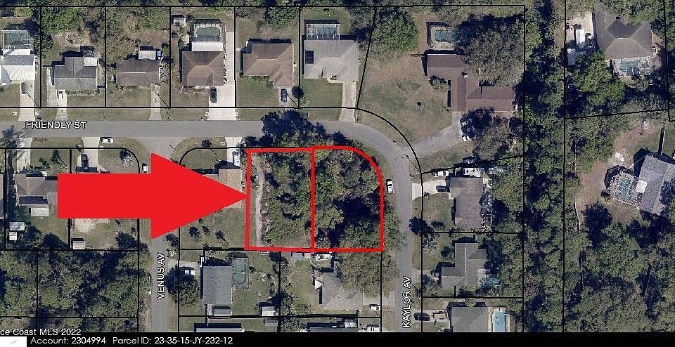 2 of 2 side-by-side adjacent lots [one interior and one corner] available in the Port St. John Unit #7 of Cocoa. Nicely located in the central part of Brevard County, this lot is just 3.4 miles -8 minutes- to Publix Shopping, about the same for access to the Indian River on your left, and about 3.4 miles -10 minutes- to the Space Coast Junior and High Schools. From Exit #208 of I-95 merge onto the Port Saint John Parkway, Turn left on Grissom Parkway and proceed north for 2 miles. Turn left on Falcon Boulevard, right on Kaylor Avenue which becomes Friendly Street. The destination will be on the left.