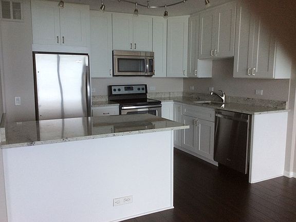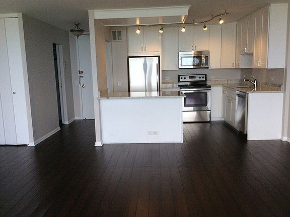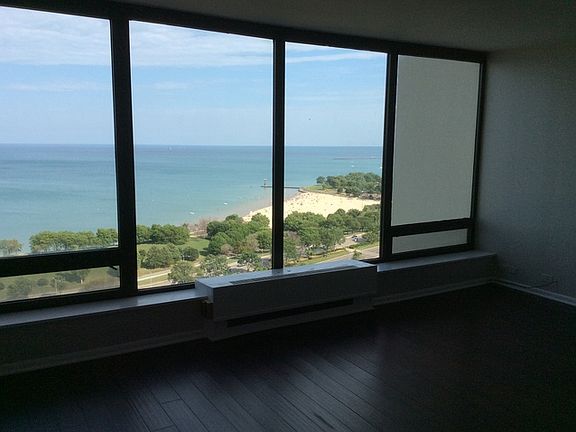 Stunning high floor east facing total renovation in wonderful full-amenity building. Beautiful unobstructed views of the lake & park from every room. Gorgeous unit includes new white kitchen with light granite countertops and all stainless steel appliances. New bath with dark wood vanity, white quartz countertop and chic square sink. All new dark hardwood floors thruout, freshly painted and new blinds installed. 5 organized closets! Extra storage locker in building. Building has 24 hr doorman, tennis, grills and laundry room. Access to outdoor pool right next door. Super convenient to buses and el. Steps to new Mariano's and very close to new Whole Foods too! Agent Owned.