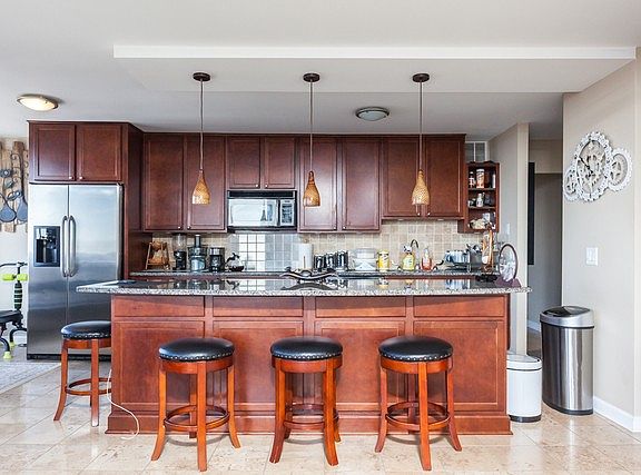 This modern unit features travertine kitchen floor, stainless steel appliances, granite countertops, stone backsplash, kitchen island with breakfast bar, 42 inch cabinets, dry bar and custom wine rack. The large main bedroom features a view of Lake Michigan and an ensuite remodeled bathroom. Also include heating, air conditioning and basic cable. The building features a 24-hour doorman, recreation deck, tennis courts, storage locker and bike room. Be close to everything Edgewater / Andersonville has to offer - bars, restaurants, shops, parks, and more! close to Clark / Sheridan / Bryn Mawr. 1 storage locker included in the rent. Shared laundry and sundeck on-site. Tenants will have access to the neighboring building's fitness center, indoor & outdoor swimming pools for an additional fee. No pets allowed. this unit will not last, tour today! *Check out the floor plan. Gross rent is $2200. 1 mo free on a 12 mo lease. Concession applied as a lump sum on the 3rd mo of the lease. Net effective / advertised rent: $2017