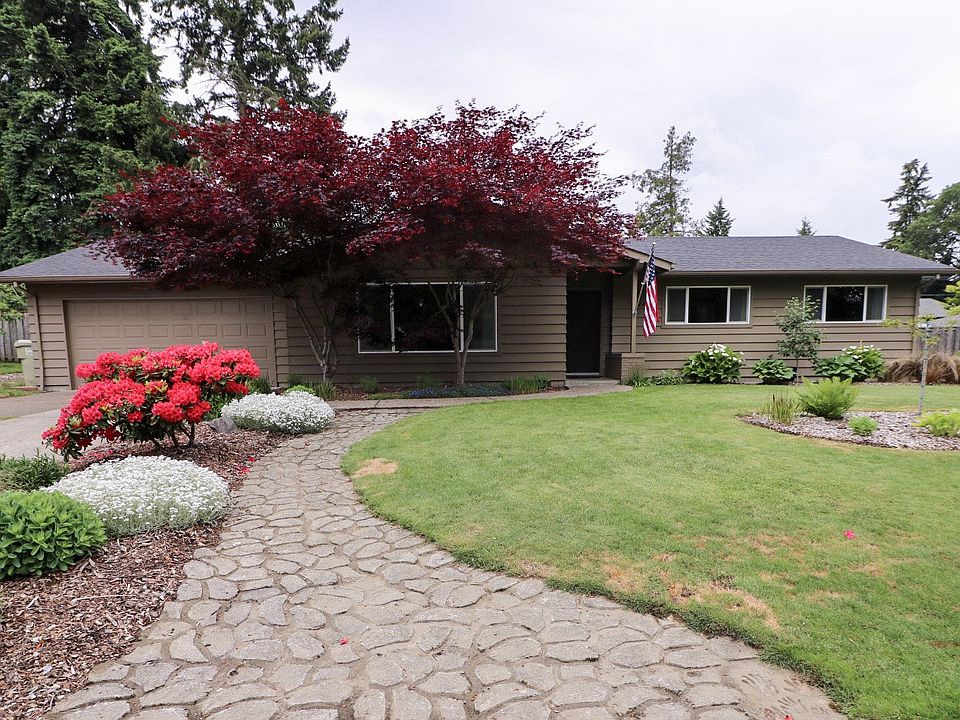 Stunning one level home in excellent condition! Spacious living room open to dining area. Newer hardwds T/O. Newer kitchen w/concrete counter tops open to family room. 2012- New roof, furnace, water heater, windows & paint. Utility rm w/sink, built-ins & pantry. Incredible private fenced backyd w/fire pit, shed, organic garden, lots of fruit tress. Huge 2 car garage w/workshop area & storage. Beautifully landscaped!!