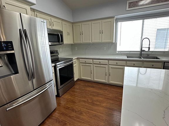 Welcome to this beautifully updated 4 bedroom, 2 bath home offering 1,820 sq ft of comfortable living space. Step inside to soaring high ceilings, warm hardwood flooring, and two spacious living rooms perfect for relaxing or entertaining. The remodeled kitchen is a chef's dream featuring sleek quartz countertops, stainless steel appliances, and abundant cabinetry. Enjoy cozy evenings by the fireplace or host gatherings in the open-concept layout that flows seamlessly to the backyard. This home also offers a versatile floor plan, tile flooring in the kitchen and bathrooms, and ample natural light throughout. Each bedroom comes equipped with a ceiling fan and closet, and the primary bedroom features a huge closet and spacious en-suite bathroom. Renter's insurance is required.