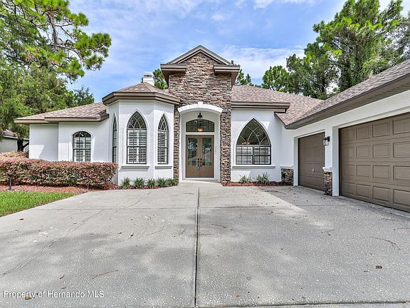 One or more photo(s) has been virtually staged. Up to $10,000 available in concessions that can be used towards interest rate buy downs! 5447 Championship Cup Lane is an exquisite 4 bedroom, 3 bathroom, 3 car garage home that sits on over a third of an acre. Looking at the home you are greeted with beautiful cathedral style windows and stone work, freshly painted exterior, and a new 2023 roof. Beyond the front entrance way, you enter into the enormous family room that boasts double tray ceilings, crown molding, built ins, gorgeous trim work, and newly installed modern flooring. The entire inside of the home has been freshly painted. The Kitchen also features tray ceilings, solid surface countertops, a built in cabinet oven, cook top, microwave and a unique separate island with its own sink. The large owners suite features a frameless bay window overlooking the pool, and its own private pool area entrance. The large En suite bathroom features a garden tub and oversized shower. Bedrooms 2, 3, and 4 are spacious and have nicely sized closets. The pool area is large and great for entertaining. The pool features its own built in spa. This home is 100% move in ready! The Air conditioning was just replaced in 2023, the pool and pool deck have been refinished, with a new gas pool heater installed. The home backs up to the golf course, however the back yard is nicely wooded for privacy. Located in Hernando County Florida. Silverthorn is a beautiful gated community centered around a semi-private, championship golf course. Situated near the Suncoast Parkway, US 41, and Cortez Blvd. Close proximity to several shopping centers, medical services, schools, and restaurants. Amenities include a community swimming pool, tennis courts, basketball court, fitness center, play area, library, and a community center. Silverthorn's restaurant is located in the nearly 25,000 sqft clubhouse and is open for breakfast, lunch, and dinner. Regularly scheduled entertainment includes music, comedy, and more.