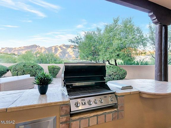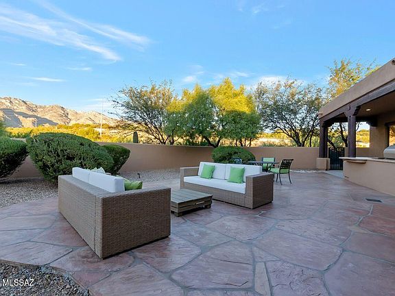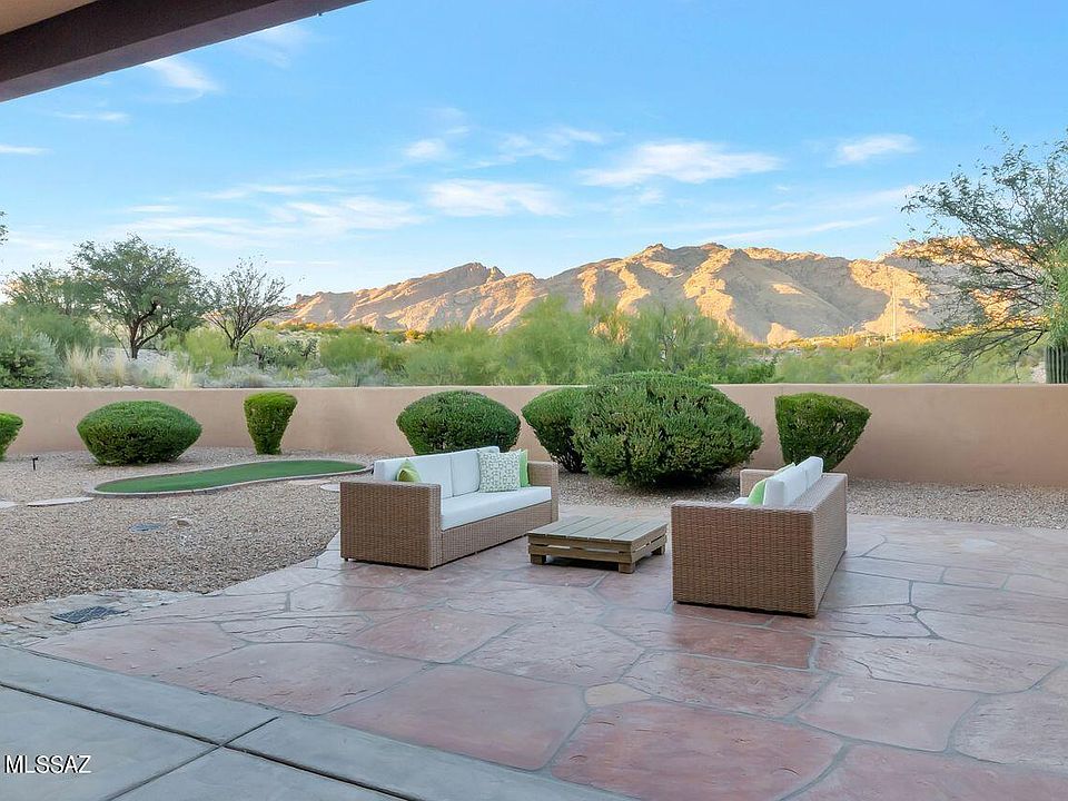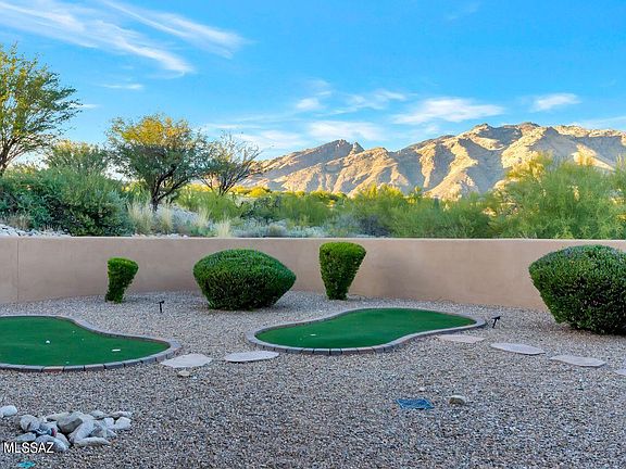 This private enclave gated community with only five custom home residence. You will be enthralled with all the custom features and the elegance of this property. Starting off with travertine floors throughout the property, 15-foot ceilings with Vega beams and corbels formal dining room and living room with a gas fireplace and a sliding glass door that leads to this amazing outdoor patio with an outdoor kitchen. Flagstone floors and countertops on the outdoor, BBQ, a putting green and the most magnificent mountain views you will ever experience in the whole city. Breathtaking is an understatement. Wraparound covered patio. Separate kitchen with a spacious breakfast nook and a large family room with built-in cabinetry and speakers for surround sound. The kitchen has a new LG refrigerator a double oven with a convection component to it a separate stainless-steel microwave and a gas cooktop with four burners. The backsplash is tumbled marble and the countertops are a gorgeous neutral colored granite All the cabinetry throughout the property is raised panel with a glaze. Double door deep pantry in the kitchen and a very large laundry room with whirlpool washer and dryer cabinetry above and a separate sink with granite countertops completes the perfect laundry room a very large and expensive three car garage with several closets that are for additional storage in the garage there is a additional door that allows you to exit into the backyard. the most breathtaking Catalina foothills mountain views that are showstoppers. Sliding glass doors throughout the property and large massive windows so that you can enjoy the indoor-outdoor living