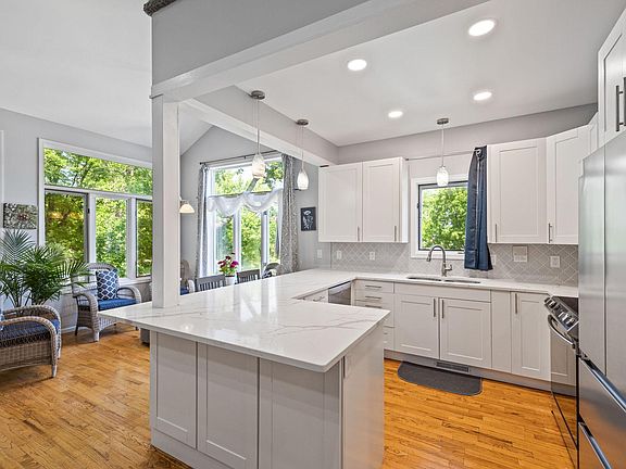 Cheapest price on all of Lake Minnetonka! Over 75 feet of lakeshore on this protected channel on Harrisons Bay. With ample depth and permanent dock 30'+ boats can be accommodated. The main floor features an open concept with huge vaulted ceilings, fireplace, hardwood floors, and kitchen with all new appliances and quartz countertops. Upstairs the huge owners suite features lake views, private bathroom, jetted tub, and walk in closet. The walkout lower level offers a huge family room with fireplace and adjacent wet bar. Lower level also includes a 4th bedroom, den, and extra storage spacewalk out. Many improvements have been made to this property but still needs finishing touches. Home being sold "as Is".