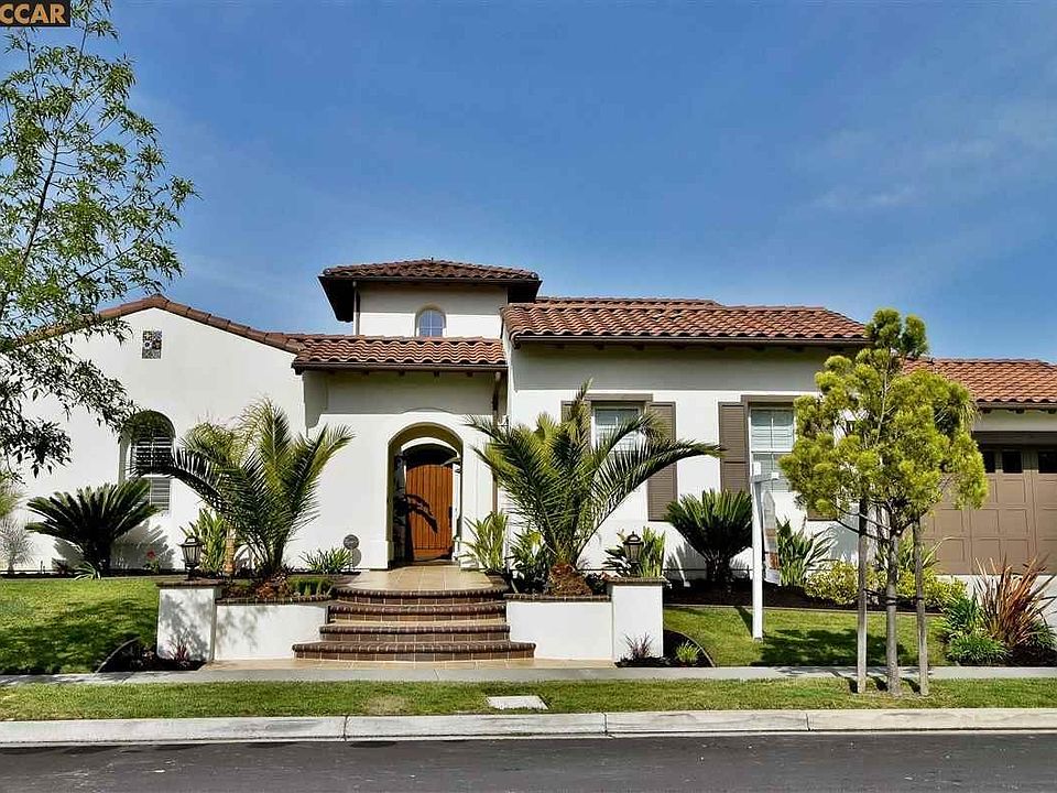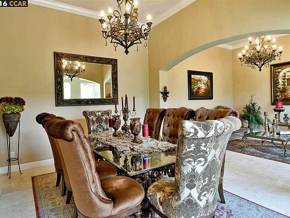 4 Bedrooms ; 3.5 Bathrooms ; 3 Car Garage; Approximately 3,795 Sq/Ft Gorgeous Mediterranean single story home in "The Pointe" development with amazing golf course views. The floor plan is spacious and open. The backyard is an entertainer's dream, with built-in BBQ, solar heated pool and spa, plenty of patio space, and views of Mt. Diablo. The private courtyard has stylish arched entry way, tropical plants, and a sitting area. The entry way is grand with beautiful travertine floors and stone medallion inlay. The hallway to the living room and dining room is filled with lots of natural light. A wall of windows with sliding door leads you out to the side courtyard. The living room features travertine stone tile floors, custom wrought iron chandelier, and crown molding. The dining room also has travertine stone tile floors, custom wrought iron chandelier, and crown molding. The family room features a sliding glass door to the patio, ample entertainment space, wrought iron chandelier, gas adobe style fireplace, custom built-in media center, built-in speakers, and amazing views of the golf course. The gourmet kitchen is spacious and perfect for entertaining. The kitchen has everything a gourmet chef could ask over; stainless steel Thermador double oven, 6 burner gas cook top, decorative hood with warming lights, granite counter tops on large island with bar seating, large breakfast nook, beautiful arched window with views of the golf course. Just off the kitchen is an office nook with built-in desk with cubby holes and large walk-in pantry. There is also a separate exit to the sparkling pool. The master suite has it's own private hall and rotunda entrance. The master bedroom features a tray ceiling, plantation shutters, Hunter Douglas blinds, engineered hardwood type flooring, amazing views, and a separate office or sitting room. There are built-in dressers and bench seating in the hallway to the spacious walk-in closets with mirrored doors. The bathroom resembles a spa with a spacious jetted soaking tub, stone tile flooring, dual vanities with decorative tile backsplash, and a separate shower with glass enclosure. The separate guest suite features plantation shutters, full private bathroom and views of the courtyard. There is extra storage for linens or belongings for a long-term guest. The bathroom has a large glass shower enclosure and decorative tile backsplash vanity. There is also a guest bathroom down this hallway with large pedestal sink and travertine stone tile flooring. As we end down the hallway, we run into the large laundry room with travertine tile flooring, sink, ample cabinets, and extra storage. The children's corridor is separated nicely on the other side of the home with a private hallway including extra storage cabinets. The two bedrooms share a full bathroom, yet each room has it's own private sink area. Both bedrooms have plantation shutters with one room having a view of the courtyard and a walk-in closet. You can vacation at home, with the built-in BBQ, solar heated pool and spa with waterfalls, and amazing views of Mt Diablo and the Bridges golf course. Johnny Miller designed this beautiful 18 hole course. The golf course is public, and boasts a club house with driving range. There is also a large community pool, basketball court and tennis court in this fabulous Bridges community. You are within walking distance to the award winning Coyote Creek Elementary school and close proximity to Gale Ranch MS and Dougherty Valley HS.