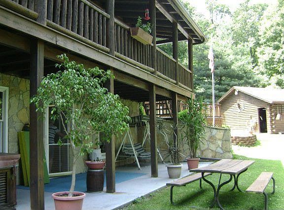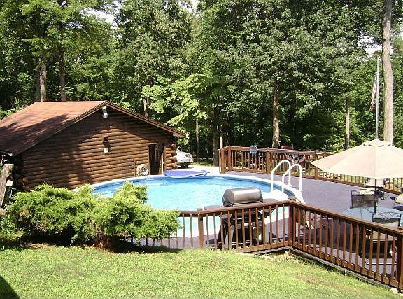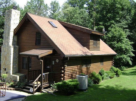 PRIVATE SETTING for this beautiful log home featuring an Open Floor Plan. Stone fireplace in GR with views of the loft above. Enjoy the 38 x 8 front porch (or covered patio below accessed from the lower level family room. The 3rd. bedroom(LL) is being used as an exercize room. Also bath and lots of storage in LL. Lots of time to enjoy the above ground pool. The pond is stocked with Bass, Blue Gill and Sunfish. Plenty of deer, wild turkey and squirrels and lots of woods. A must see home