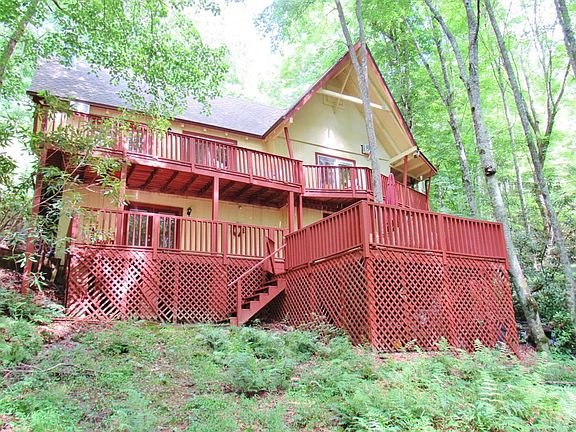 Live in a Treehouse in the mountains of Western North Carolina. Adorable Chalet, with lots of living space inside & out, with a tumbling mountain stream with waterfalls that will soothe your cares away. Enjoy entertaining on the many spacious decks, that are accessible from almost every room. The interior is just as alluring with 3 BRâS, 2.5 baths, vaulted beamed ceilings with a wood burning fireplace in the living room & warm wood real pine planks. The eat-in kitchen is charming & has been updated with newer countertops, stainless appliances & light fixtures & has plenty of cabinet space. There are 2 master bedrooms with en-suites one on the main floor, & a bigger one on the lower level that has a huge walk-in closet & its own sliding glass doors that lead to a covered porch, that is great for enjoying your morning coffee. Downstairs is also a family room/den and laundry rm. There is also a loft bedroom with its own 1/2 bath attached. There is a small yard in the back for pets or kids to play. This house has been well taken care of over the years & is move in ready, just waiting for its new owner. Easy access just off of a paved road in a great neighborhood. Come enjoy mtn. living