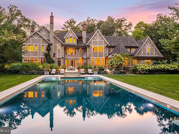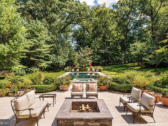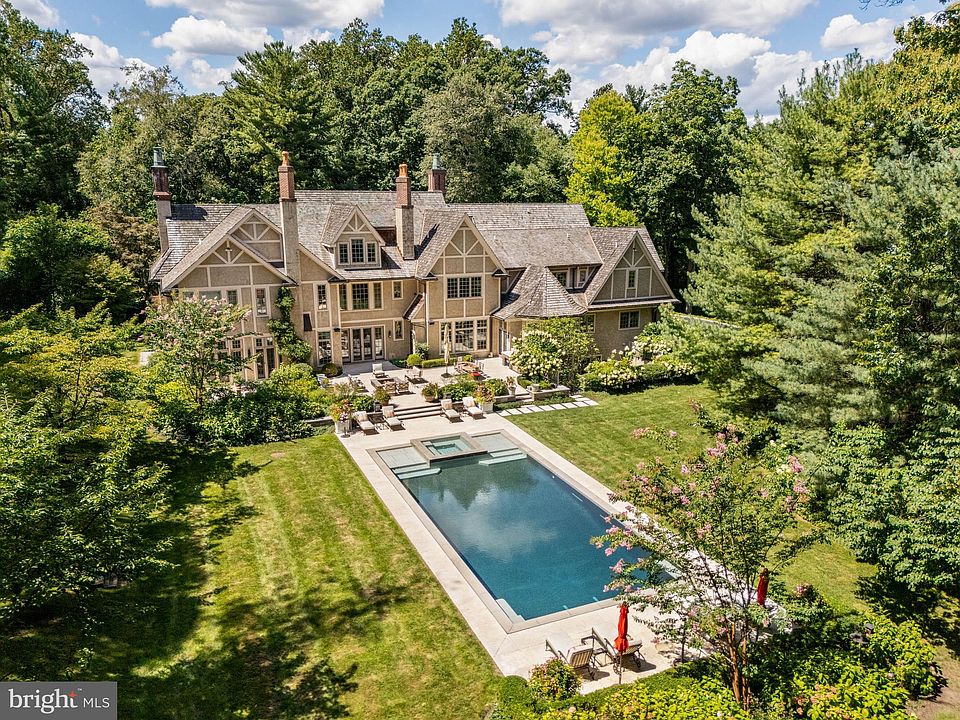 Surrounded by a perimeter of mature forest including evergreens and accessed through a formal gate, Arbor Aves is a Stone Manor estate positioned on one of Northside Haverford’s most coveted and quiet lanes. The front façade combines extraordinary stone and brickwork in a composition of enduring elegance, while the rear elevation, accented with board and batten details, is breathtaking in its symmetry and scale. Framed by gardens and hardscaping designed by Chuck Hess, the light-stone terraces, resort-quality vanishing-edge pool with perimeter overflow, spa, fire-pit, and a fully equipped outdoor kitchen with stainless steel grill create a setting where everyday living feels like a retreat. A front-to-rear center hall with inlaid stone floors, and a sitting nook sets a tone of refinement the moment you enter. The living room combines architectural balance with warmth, featuring a fireplace, abundant natural light from 2 exposures, and a charming front window nook that invites reading, conversation, or quiet reflection. The dining room is enriched with ceiling moldings, a cushioned window seat, and ornamental fireplace, while the library offers finely crafted millwork and the solarium glows with wrap-around windows and honed slate flooring. Throughout the main living areas, hardwood floors of white oak—aligned with today’s design preferences—underscore the home’s sophisticated yet timeless palette. Five fireplaces are placed across the home’s 4 finished levels, blending architectural beauty with comfort. At the heart of the residence, the Clive Christian kitchen is a showpiece of honey-toned cabinetry, polished Calacatta Gold marble, and professional La Cornue range, anchored by an island with seating for 4. The adjoining breakfast room, crowned by a soaring 12-foot ceiling, overlooks the gardens and flows to the family room, where a fireplace and custom shelving invite gathering. Thoughtful design touches abound: a walk-in pantry with Thermadore wine storage and direct inside access to the garage simplifies unloading groceries, while a “command center” with built-in desk, cabinetry, and shelving provides a practical hub for household management. Crestron automation makes listening to music or controlling lighting and HVAC a breeze. The primary suite is a retreat of extraordinary scale and comfort, complete with a private sitting room and fireplace, a beverage center, dishwasher, 2 fully customized walk-in closets, and dual spa-like onyx baths with soaking tub, slab counters, and shared double-sided shower. A 2nd-floor landing introduces another architectural moment—a cozy sitting nook with custom shelving and a window overlooking the front courtyard, creating a quiet retreat above the main foyer. Five additional en-suite bedrooms complete the family level, while the 3rd floor provides flexible space or an in-law suite with living room, generous bedroom suite with full bath, walk in closet, cedar closet, and additional storage. The finished lower level is designed for recreation and entertaining, with a professional gym, state-of-the-art theater, walk-in wine cellar, and full wet bar with large island for entertaining, full size dishwasher, refrigeration and cabinetry. Two full bathrooms serve this level: one positioned as a dedicated poolside cabana with changing area and direct access to the gardens, the other adjacent to the exercise room. Every space has been crafted with the same level of finish found throughout the home. An elevator serves all 4 levels. Green features—cedar shake roof, Pella Architectural Series windows, blown-in insulation, Energy Star HVAC, permeable pavers, and water-saving fixtures—demonstrate the home’s thoughtful design and efficiency. Arbor Aves is more than a residence; it is an experience. Morning light fills the whole rear expanse, spend mornings or afternoons around the infinity pool or in the theater, and evenings draw family, friends to the terraces,