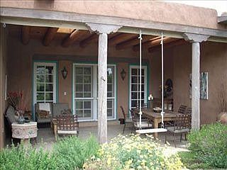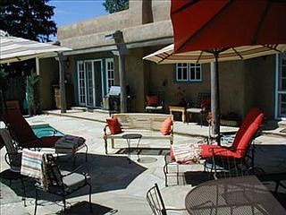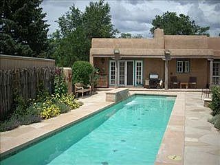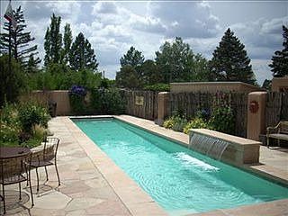 Just 1 mile from the Plaza, this gorgeous home welcomes you with extensive flagstone patios, vibrant gardens & a 50-foot lap pool with waterfall. Lovingly maintained home features a remodeled kitchen, great room with high ceilings, large fireplace & a deep covered portal overlooking the dazzling grounds. Master Suite with direct outdoor access & kiva fireplace. Third bedroom has separate entrance, perfect for home office. An outdoor hot tub offers another way to relax in this rare offering.